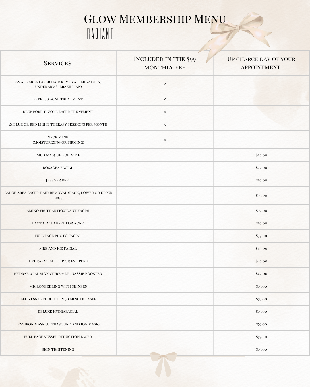 Our Glow Membership gives you glowing results with monthly professional skin treatments at Radiant Skin Clinic. For just $99/month, members receive one treatment each month from our Glow menu, keeping your skin radiant, healthy, and refreshed all year long.